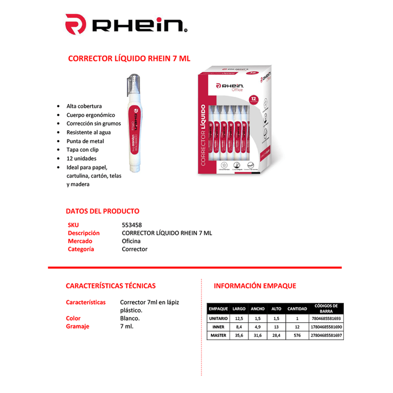 Corrector Liquido Punta Metalica 7 Ml 1 unidad Rhein
