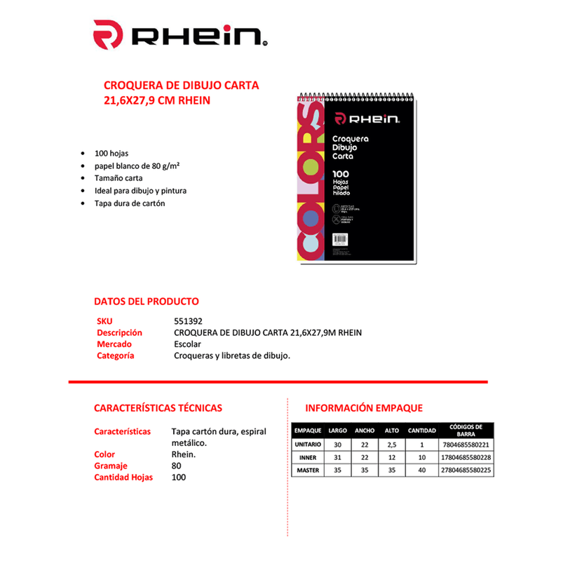 Croquera Carta 21,6 x 27,9 Cm 100 Hojas Rhein