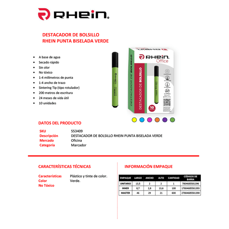 Destacador De Bolsillo Punta Biselada Verde Rhein