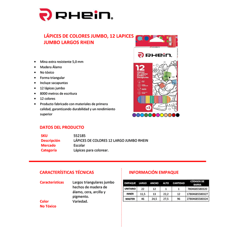 Lapices 12 Colores Largos Jumbo Triangulares Rhein + Sacapuntas