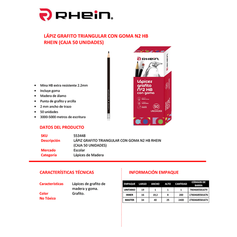 Lapiz Grafito N2 Hb Con Goma Hexagonal Mina Extra Resistente 1 unidad Rhein