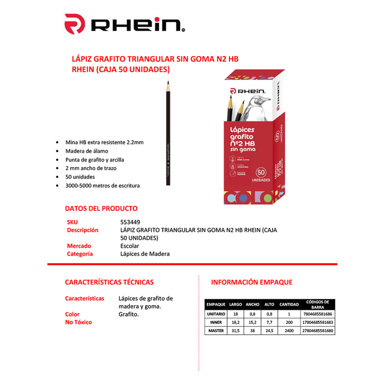 Lapiz Grafito N2 Hb Sin Goma Hexagonal Mina Extra Resistente 1 unidad Rhein