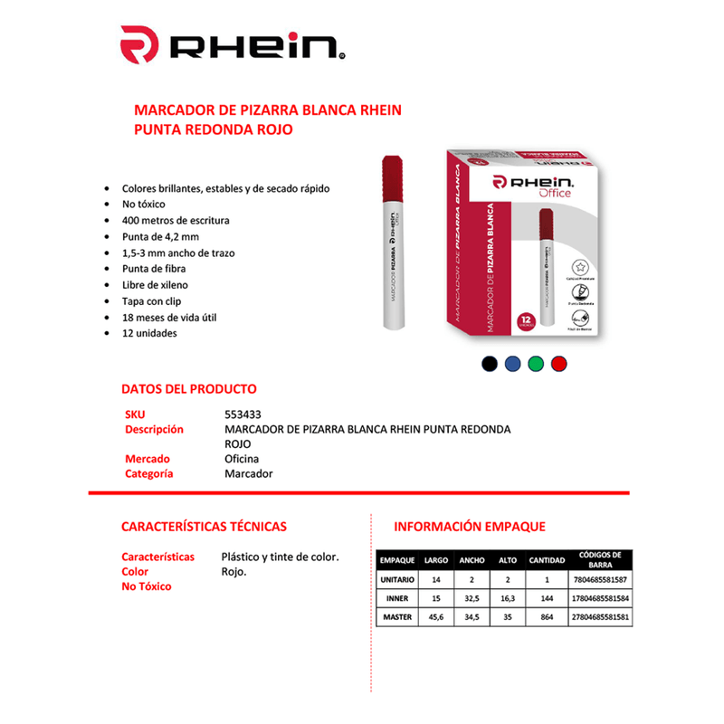 Marcador De Pizarra Punta Redonda Rojo Rhein