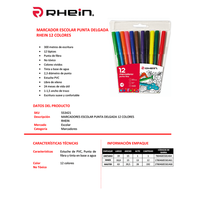Plumon Escolar Punta Fina 12 Colores Rhein